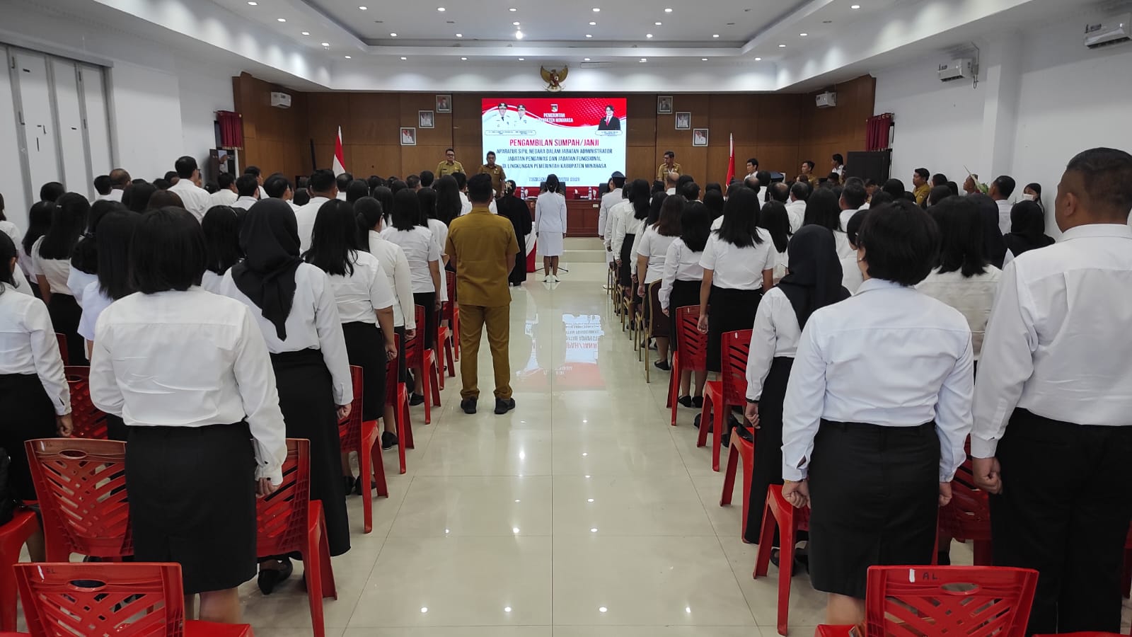 Sebanyak 127 pejabat eselon III dan IV di lingkungan Pemerintah Kabupaten Minahasa dilantik dan diambil sumpah janji jabatannya dalam acara pelantikan yang dipimpin oleh Sekretaris Daerah Minahasa, Dr Lynda Deisye Watania, MM. MSi, di ruang sidang Kantor Bupati, Tondano, Selasa (8/8/2023).