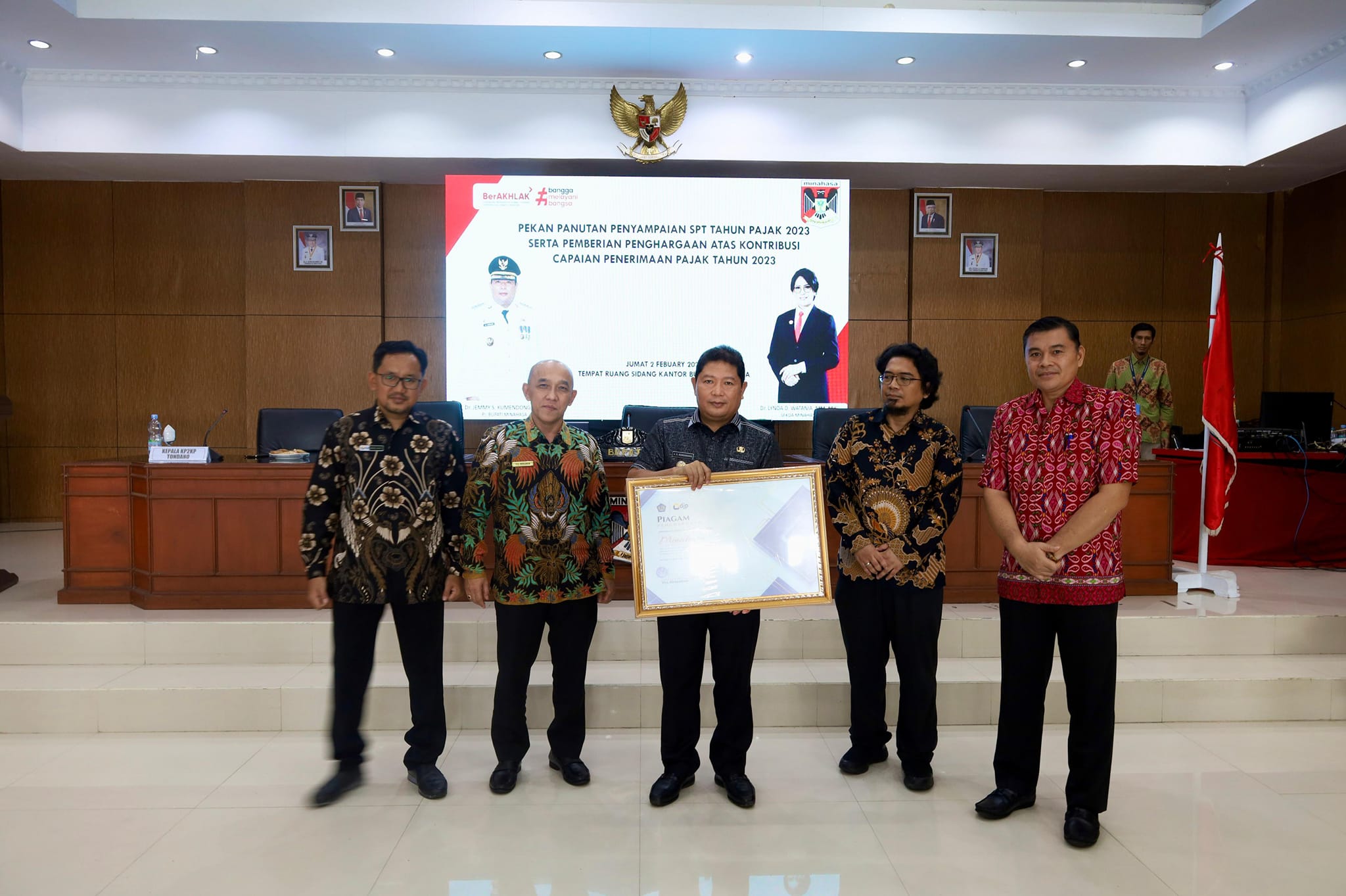 Penjabat Bupati Minahasa Dr. Jemmy Stani Kumendong, MSi (JSK) menerima penghargaan atas kontribusi capaian penerimaan pajak tahun 2023 dari Kantor Pelayanan Pajak (KPP) Pratama Bitung, Jumat (2/2/2024).