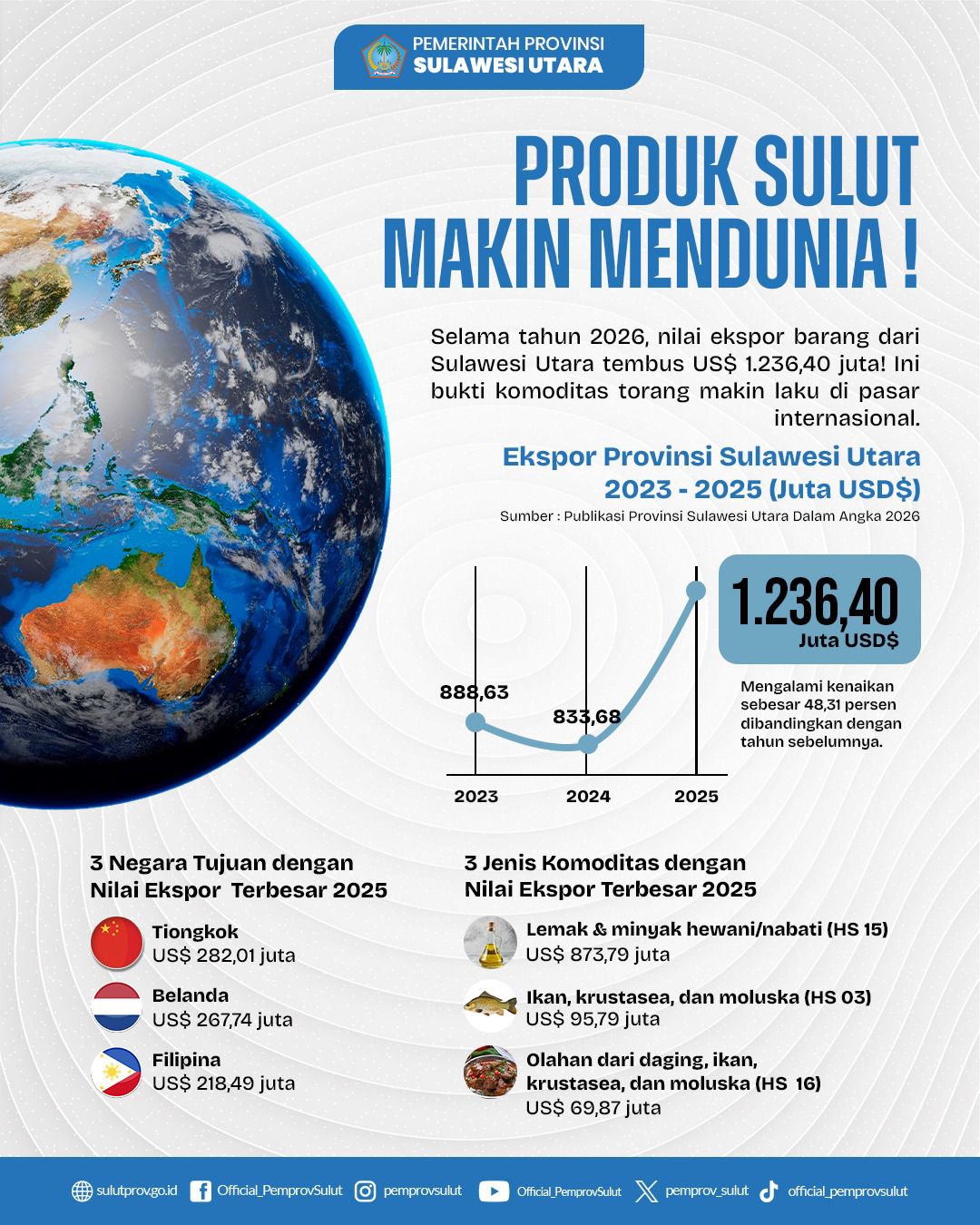 • Produk Sulut Mendunia : Ekspor Melonjak 48% di pasar internasional, produk-produk asal Sulut semakin kompetitif. Nilai ekspor barang dari Sulut sepanjang tahun 2025 sukses menembus angka US$ 1.236,40 juta, mengalami kenaikan sebesar 48,31% dibandingkan tahun sebelumnya.