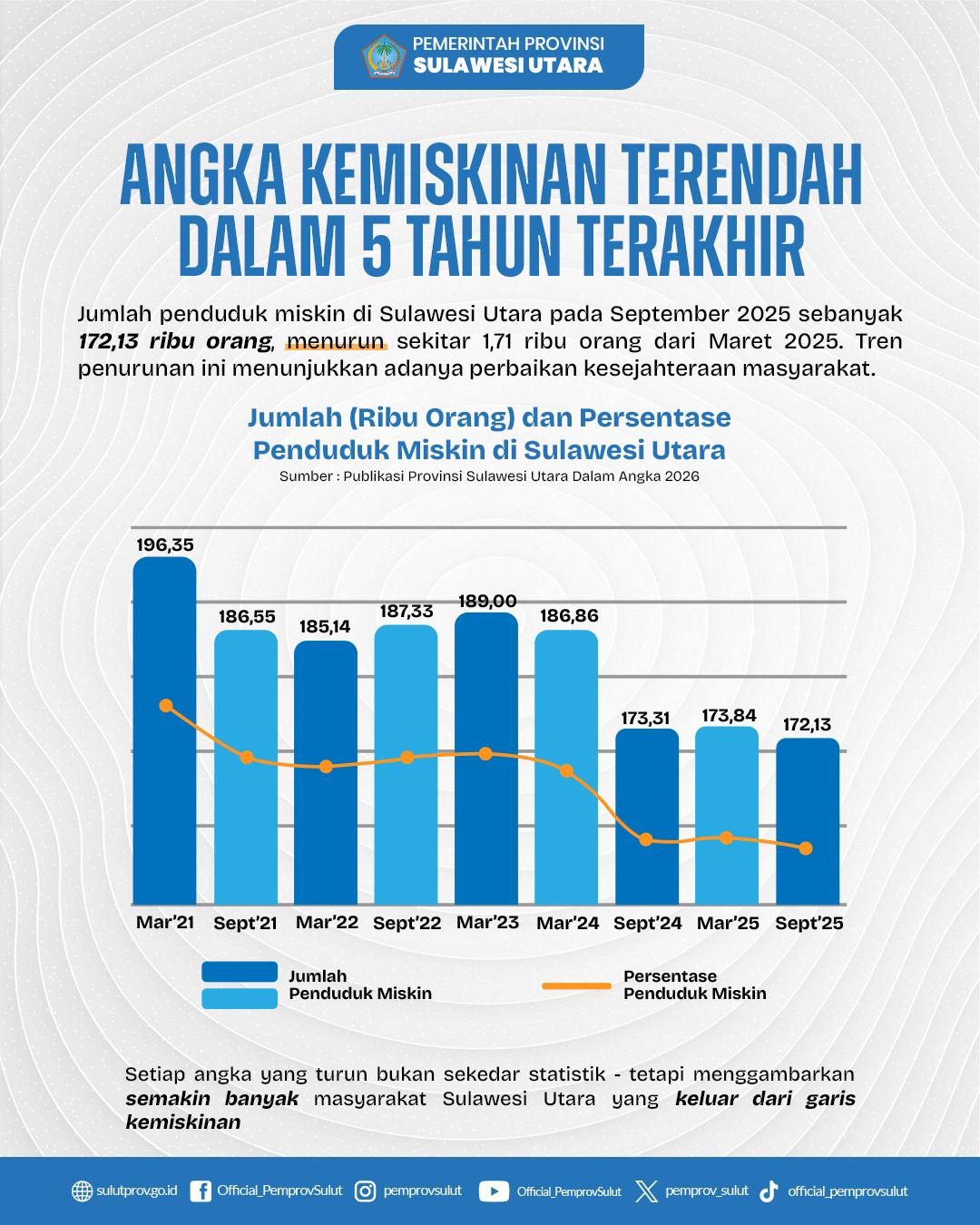 •Kesejahteraan Rakyat : Angka Kemiskinan Terendah dalam 5 Tahun. Salah satu pencapaian paling bermakna bagi masyarakat adalah penurunan angka kemiskinan yang konsisten. Per September 2025, jumlah penduduk miskin di Sulut tercatat sebanyak 172,13 ribu orang.