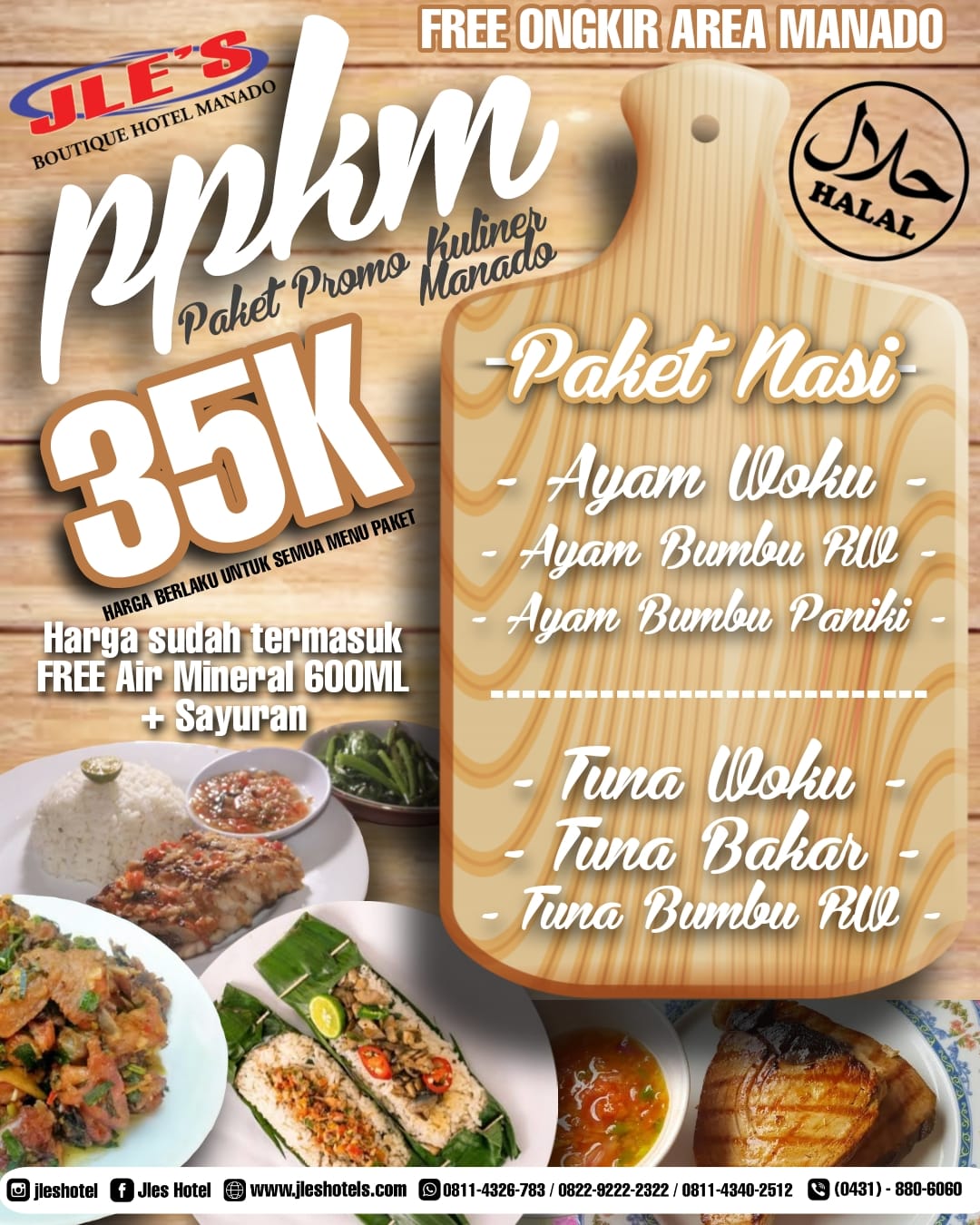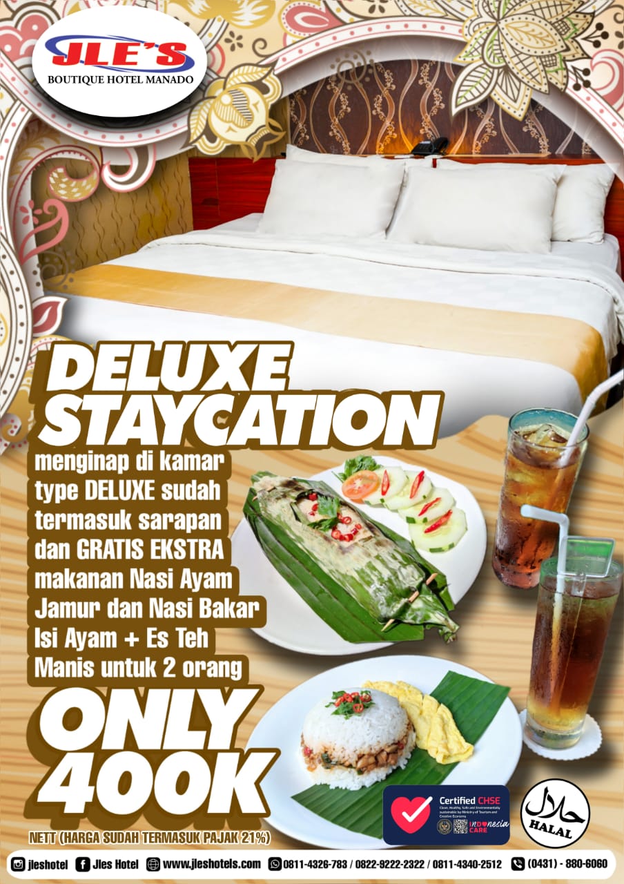 Namun bukan itu saja, ada juga saraba hingga minuman ringan prost beer. Semua tersedia dan spesial bagi tamu yang menginap di kamar Deluxe yang termasuk sarapan pagi dan Gratis Ekstra nasi ayam jamur dan nasi bakar isi ayam plus es teh untuk dua orang. Sementara untuk reservasi langsung bisa segera menghubungi sales eksekutif JLES Hotel Manado Christian Sumayow di nomor 0852-5628-6354. Tunggu apa lagi? (yaziin solichin)