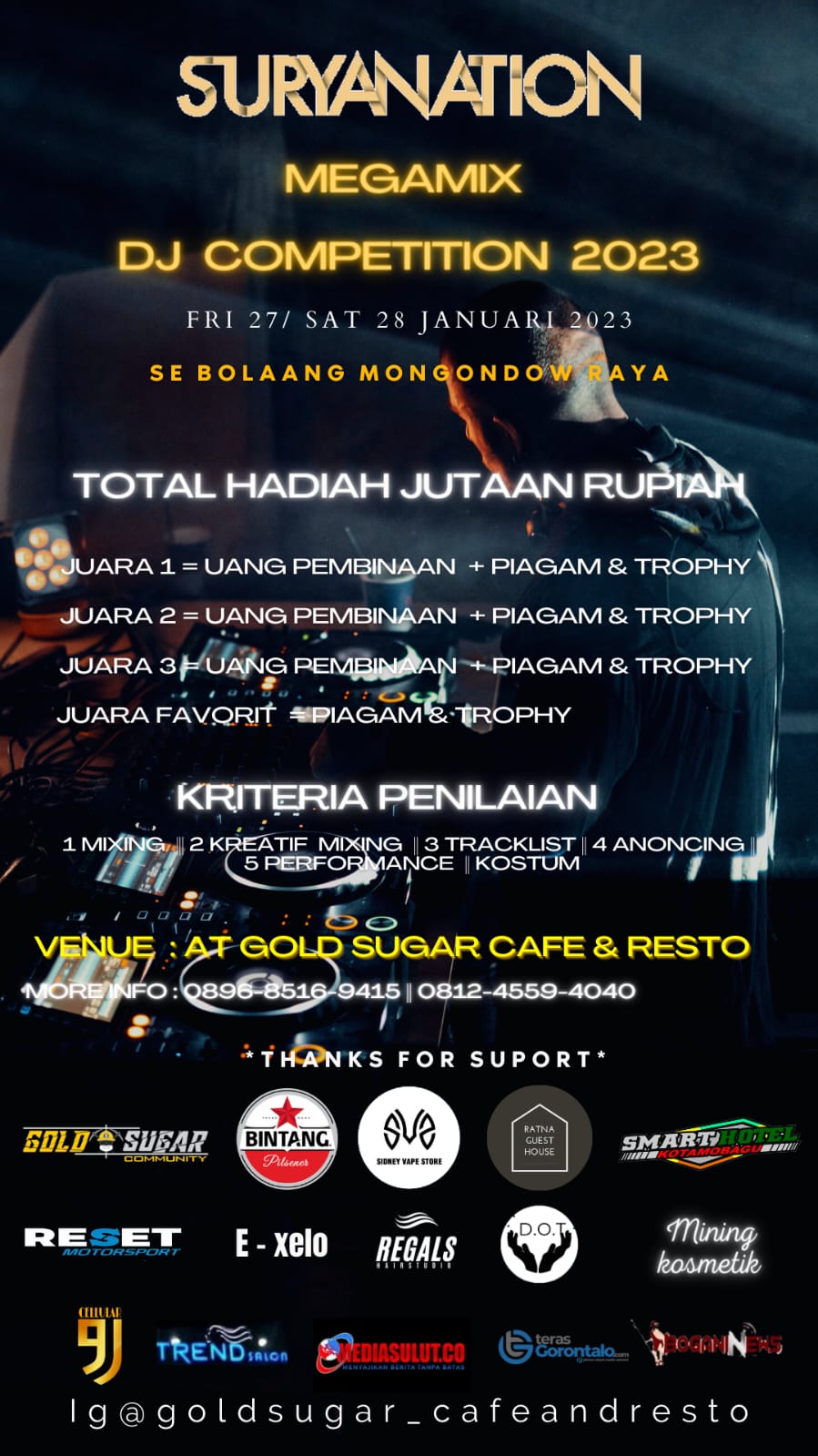 Gold Sugar Cafe dan Resto yang berada di Kelurahan Genggulang, Kecamatan Kotamobagu Utara, mengadakan DJ Competition regional Bolaang Mongondow Raya. Para peserta pun terlihat sangat antusias dalam mengikuti lomba yang memperebutkan hadiah jutaan rupiah tersebut.