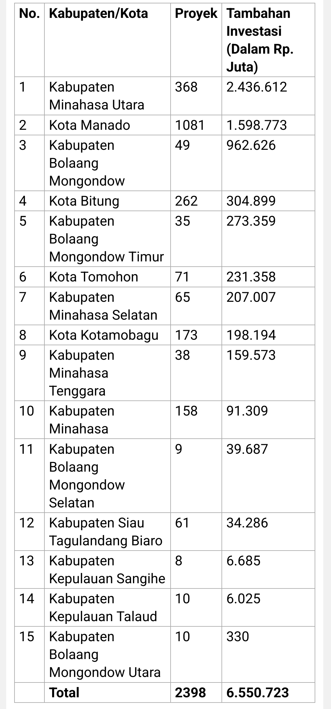 Pasca ditetapkan sebagai satu dari lima Destinasi Pariwisata Super Prioritas (DPSP) di Indonesia yakni Likupang, Kabupaten Minut mampu mencapai realisasi investasi tertinggi dari 15 kabupaten/kota (lihat grafis) yang ada di Provinsi Sulawesi Utara (Sulut).