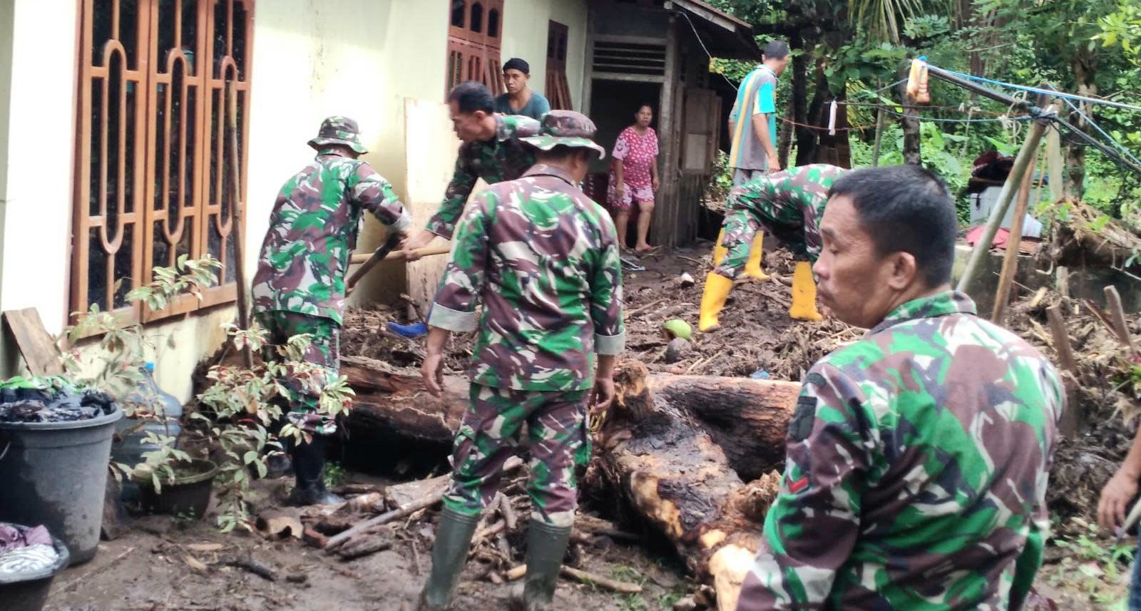 TNI juga tak kenal lelah membantu masyarakat membersihkan rumah yang terdampak bencana.