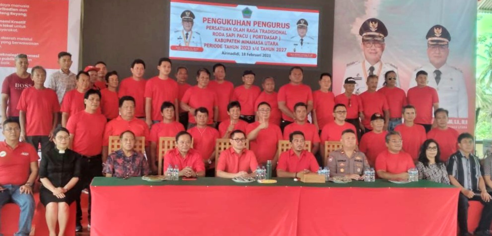Bupati Minahasa Utara (Minut) Joune Ganda, mengukuhkan kepengurusan Persatuan Olahraga Tradisional Roda Sapi Pacu (PORTDASAP) Minut masa Bhakti 2022-2025, di JG Center Sabtu (18/2/2023).