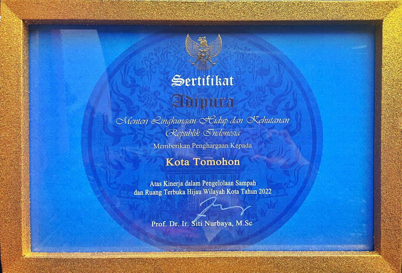 Kota Tomohon kembali meraih penghargaan berupa Sertifikat Adipura Atas Kinerja dalam Pengelolaan Sampah dan Ruang Terbuka Hijau Wilayah Kota Tahun 2022.