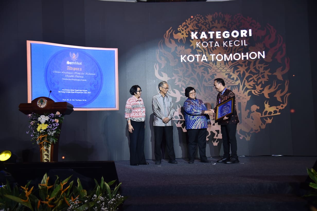Penghargaan Sertifikat Adipura diterima Walikota Tomohon Caroll J A Senduk SH, diserahkan oleh Menteri Lingkungan Hidup dan Kehutanan Dr Ir Siti Nurbaya MSc, dalam acara penganugerahan penghargaan Adipura 2022 serangkaian kegiatan peringatan Hari Peduli Sampah Nasional (HPSN) yang digelar di Auditorium Dr Sudjarwo, Gedung Manggala Wanabakti, Jakarta, selasa (28/2/2023).