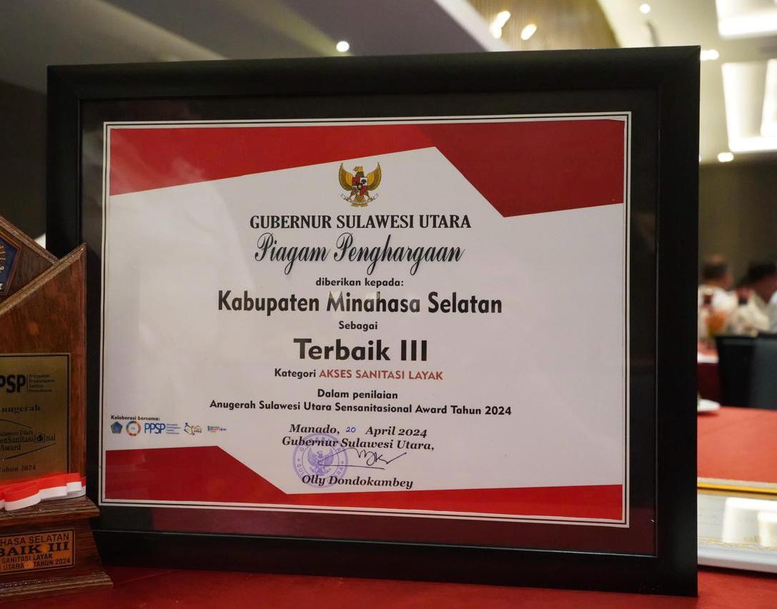 Selanjutnya untuk Sensanitasi award yang dinilai antara lain pengelolaan sanitasi seperti ketersediaan jamban (WC) dan Bebas Buang air besar sembarangan. Penghargaan ini kiranya menjadi trigger untuk peningkatan kualitas pembangunan dan sanitasi di Wilayah Kabupaten Minsel.