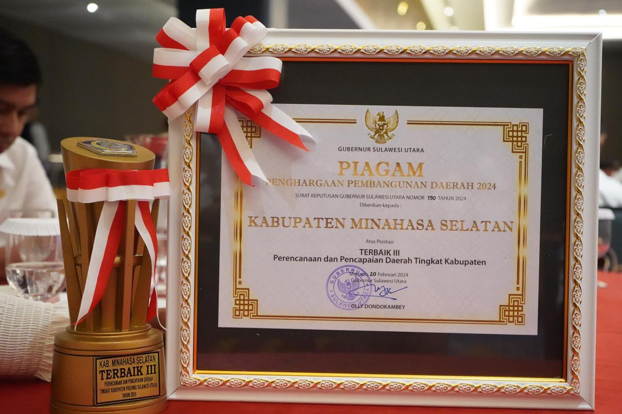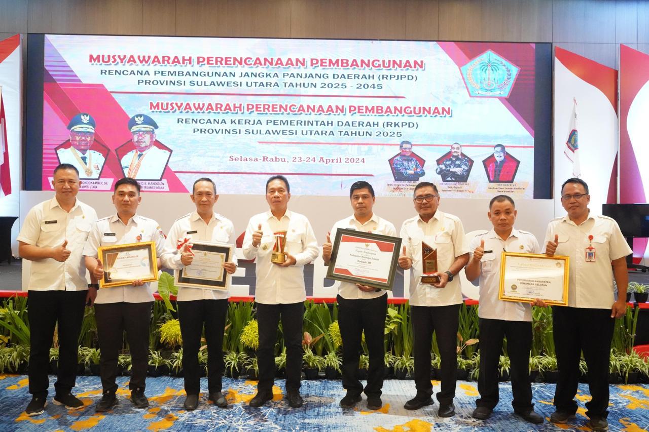 Penghargaan tersebut diserahkan pada pada kegiatan Musyawarah Perencanaan Pembangunan Rencana Pembangunan Jangka Panjang Daerah (RPJPD) Provinsi Sulawesi Utara Tahun 2025-2045 dan Musyawarah Perencanaan Pembangunan Rencana Kerja Pemerintah Daerah (RKPD) Provinsi Sulawesi Utara Tahun 2025, bertempat di Hotel The Sentra Manado Pada Rabu 24 April 2024.