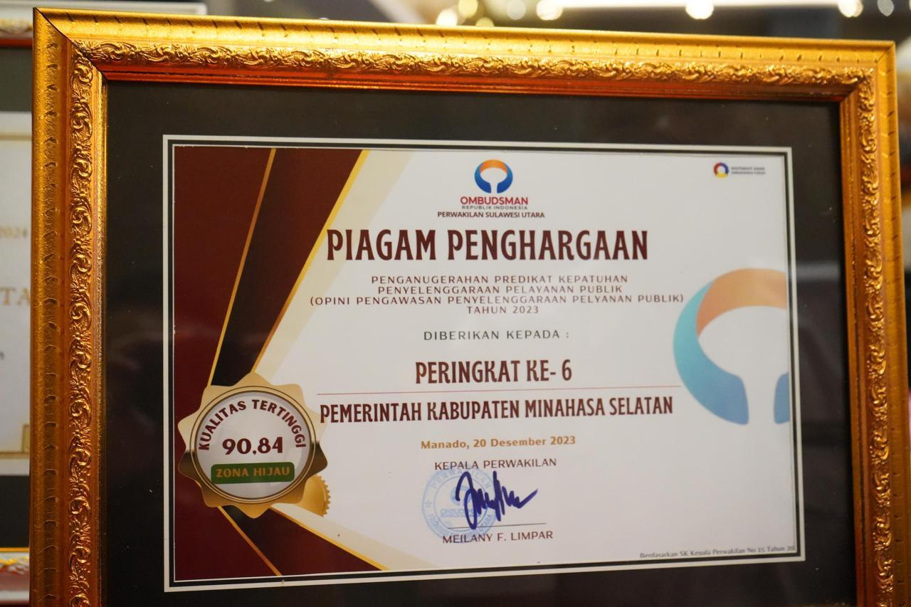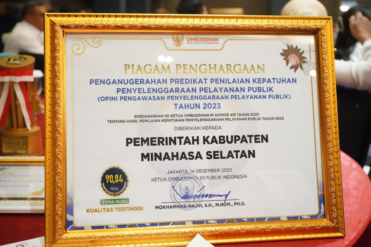 Perbaikan ini ditandai dengan keberhasilan Pemkab Minsel memperoleh kenaikan nilai kepatuhan penyelenggaraan pelayanan publik yang cukup signifikan dari Ombudsman RI, dari sebelumnya 63,78, zona kuning kategori C kualitas sedang di tahun 2022 naik menjadi 90,84 zona hijau kategori A kualitas tertinggi.