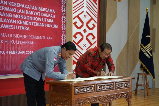 Dewan Perwakilan Rakyat Daerah (DPRD) Kabupaten Bolaang Mongondow Utara (Bolmut), menandatangani kesepakatan bersama Kantor Wilayah (Kanwil) Kementrian Hukum (Kemenkum) Sulawesi Utara (Sulut). (4/2/2025).