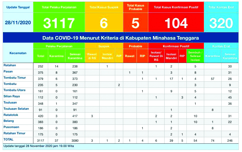 Sedangkan, 1 kasus probable di Mitra menyusul 104 kasus positif yang didata Satgas Covid-19. “Perempuan berumur 56 tahun, asal Kecamatan Pasan Desa Tolombukan Barat. Ditetapkan sebagai kasus probable yang disertai penyakit lain dan saat ini sementara dirawat di RSUD Noongan,” ungkap Kepala Dinas Kesehatan Helny Ratuliu.